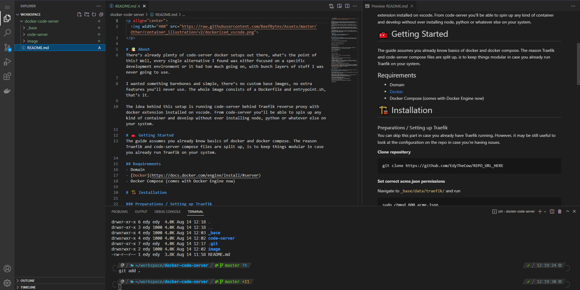 This is an outdated attempt to setup code-server, if you're looking for something similar, use Coder instead. I have a quick guide on running Coder in production under Traefik: https://github.com/EdyTheCow/docker-coder